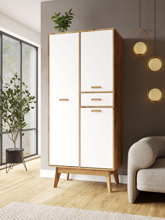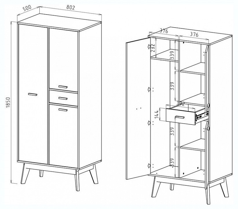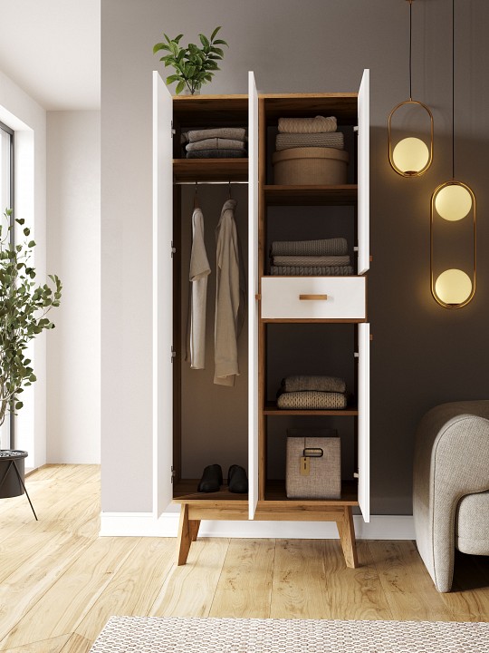 - Комплектация: 1 штанга для вешалок, 1 ящик, 3 дверцы, 3 полки.
