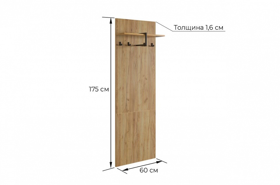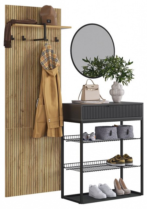 - Комплектация: вешалка-полка - 600х16х1750 мм, зеркало настенное - 550х4х550 мм, стеллаж для обуви - 750х334х905 мм.