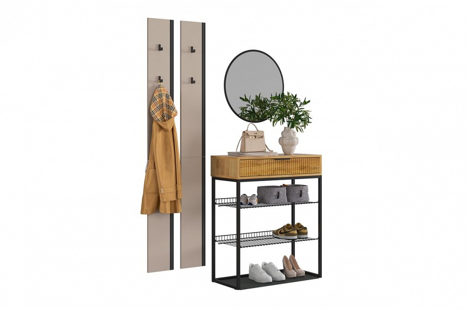 - Комплектация: зеркало настенное - 550х4х550 мм, стеллаж для обуви - 750х334х905 мм, 2 вешалки настенные - 200х16х1750 мм.