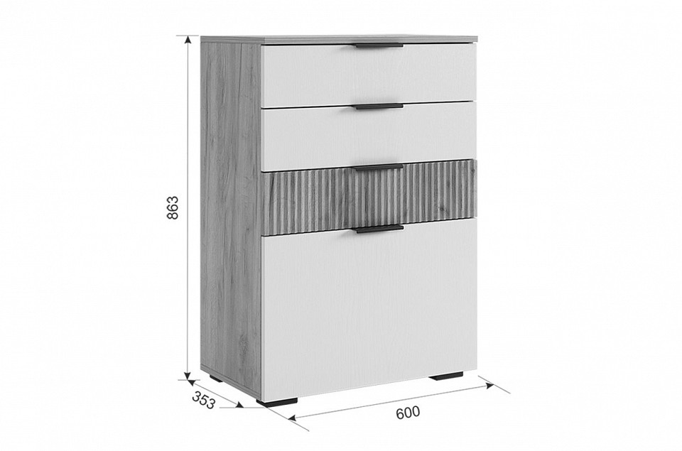 - Комплектация: зеркало настенное - 550х4х550 мм, комод - 600х354х863 мм, 2 вешалки настенные - 200х16х1750 мм.