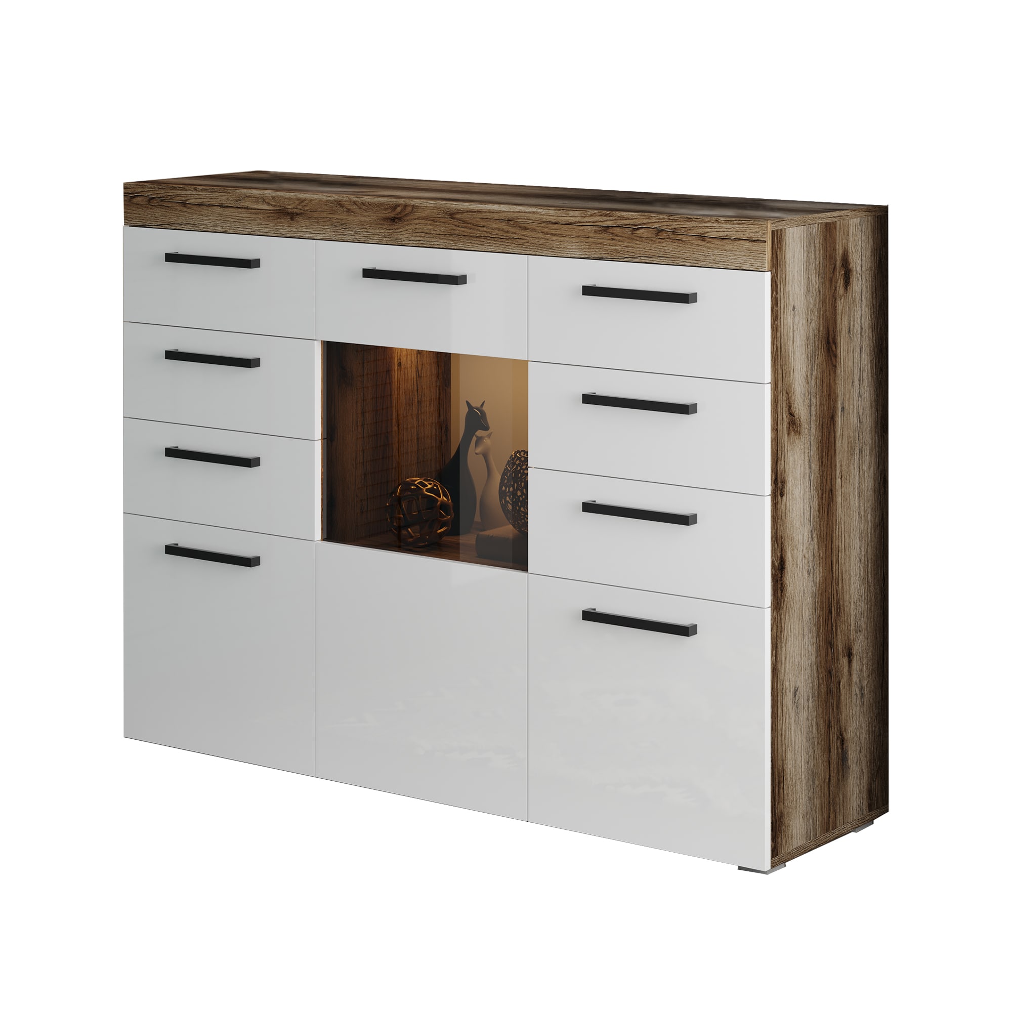 Комод “Бастон” выполнен в современном стиле и представляет собой идеальное сочетание функциональности и эстетики. Изготовлен из высококачественного материала, который придает ему прочность и долговечность. Белый глянцевый фасад комода эффектно контрастирует с темным основанием, создавая стильный и гармоничный образ. Комод имеет множество выдвижных ящиков, которые обеспечивают достаточно места для хранения одежды, белья и других предметов домашнего обихода. На верхней поверхности комода можно разместить предметы декора, фотографии или комнатные растения, дополняя интерьер вашего дома. “Бастон” прекрасно подойдет для любого интерьера, будь то спальня, гостиная или прихожая. Он станет незаменимым элементом вашего дома, обеспечивая удобство хранения вещей и украшая ваш дом своим изящным дизайном..
