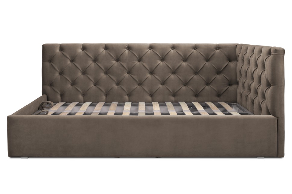 Угловая кровать будет актуальна как для детей, так и для взрослых. Мягкое изголовье создает дополнительный уют в интерьере. Качественная стяжка с декоративными пуговицами добавляет объемности модели. Кровать выполнена из качественного микровелюра, который с легкостью чистится при необходимости. Изделие оснащено подъемным основанием ортопедическим основанием . Возможно выполнение на правый или левый угол по вашему желанию.Возможно изготовление с пуговицами-стразами. Задняя спинка обшита технической тканью, при необходимости можно дополнительно заказать изготовление в основной ткани