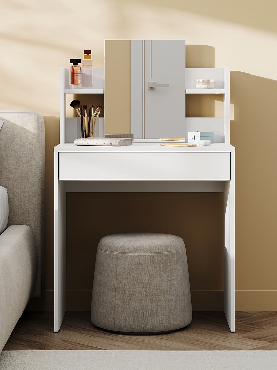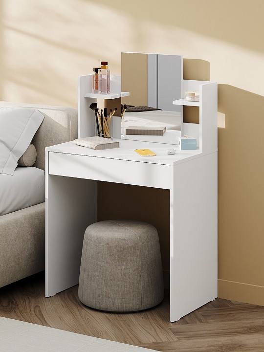 СТМ-1202 туалетный стол шириной 724мм и дополнительными полками, с зеркалом 350х450 мм. Элегантный и функциональный туалетный стол с зеркалом и полками станет незаменимым предметом мебели в вашей спальне. Стол вписывается в любой интерьер благодаря современному дизайну, сочетает в себе функциональность с элегантность, а качественные материалы обеспечивают долговечность.